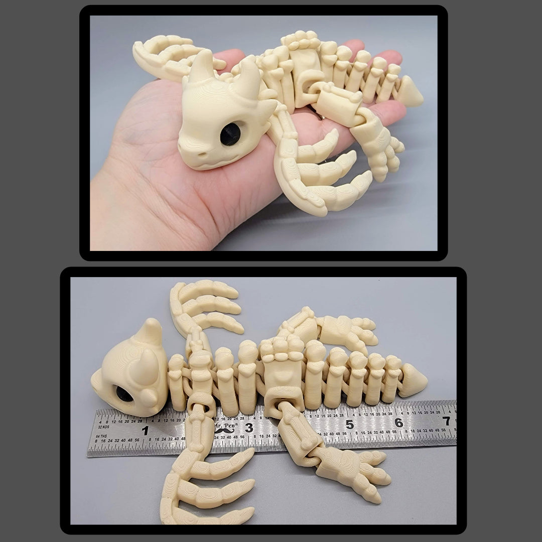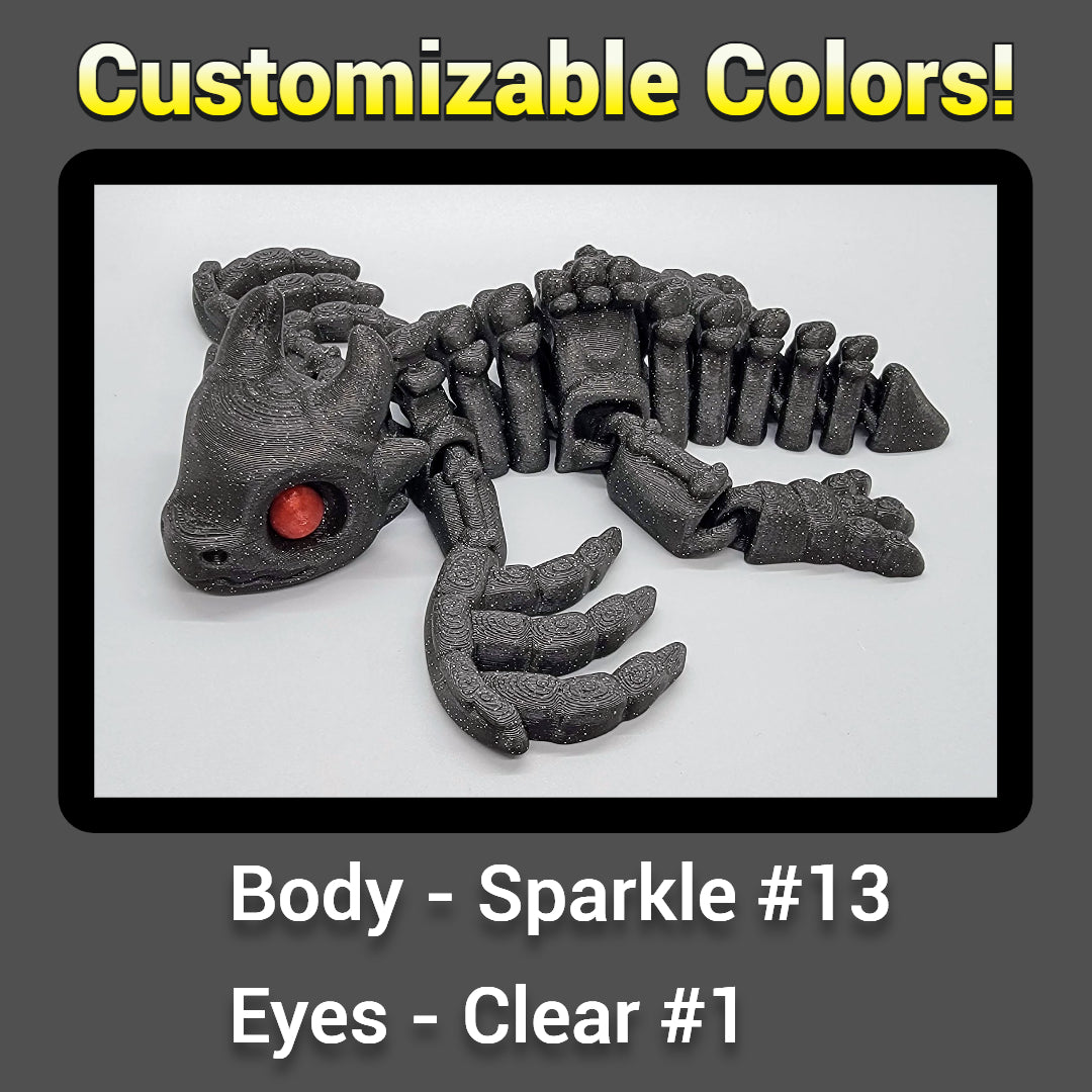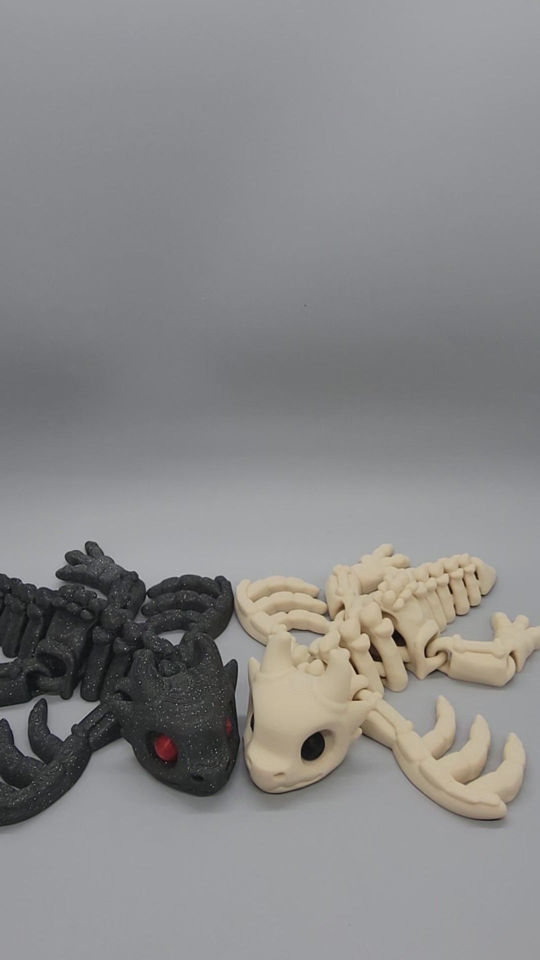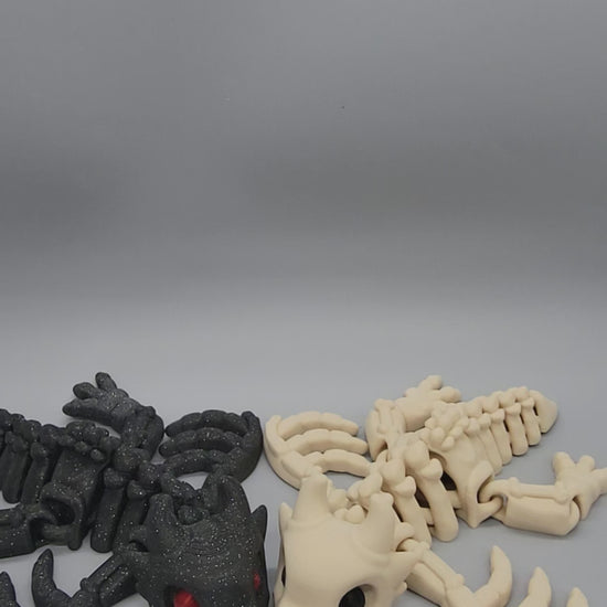 The phantom red color is perfectly creepy for the skeletons, semi-translucent, faintly glittery, and they also look like museum fossils! The sabertooth was a free gift! Thank you! It balances off the trio when I put them on the mantle (they are outside in this photo to see the colors better). The photo doesn’t do justice for the black holo’s appearance—it’s way more fabulous in real life. It has fantastic rainbow glitters that just gleam and sparkle in the right light (just like black holo nail polish). It’s such a beautiful filament and looks awesome on a skeleton!