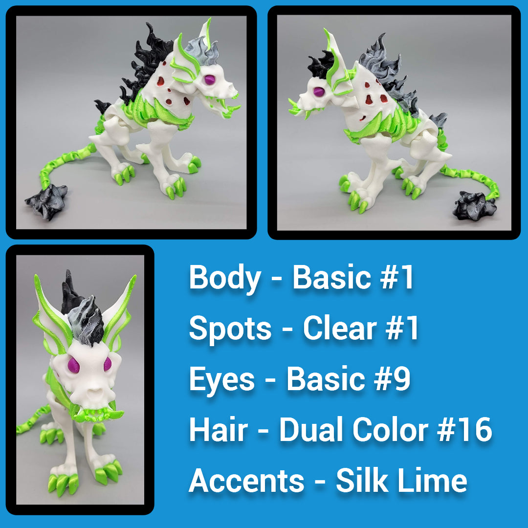 Unleash the Twisty Hellhound ~ a terrifyingly fun articulated collectible with fiery style. This 3D printed model is fully poseable with smooth articulation, customizable colors, and a cryptic, otherworldly design. Whether displayed on a shelf or used as a unique desk companion, the Twisty Hellhound adds a bold touch to any collection.